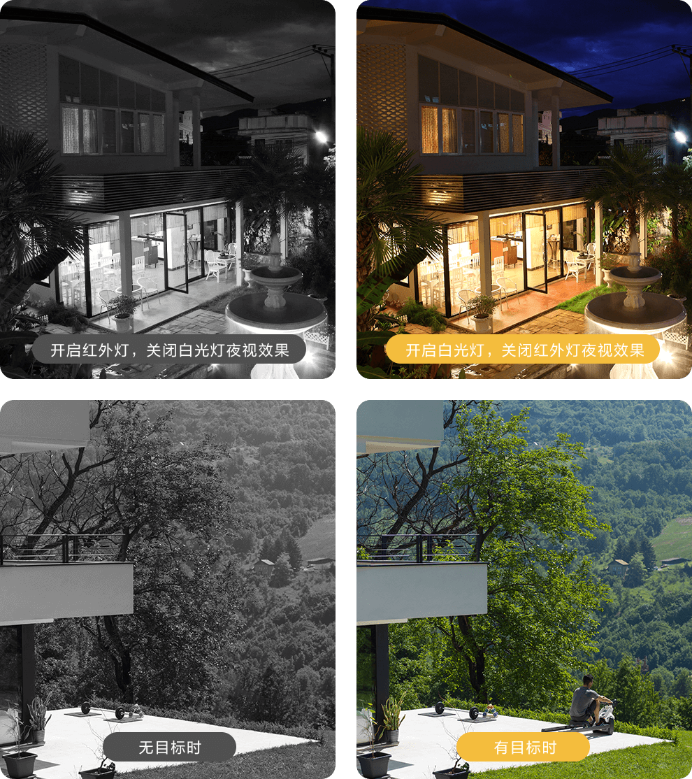 注:智能全彩夜视下,默认为红外补光黑白画面,侦测到人形目标时,自动切换为白光补光全彩画面
