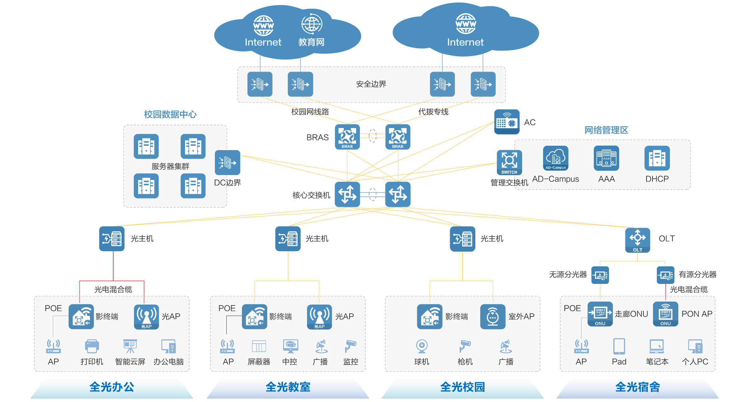 全光解决方案设计的接入产品,基于新一代高性能硬件架构和H3C公司先进的Comware V7软件平台开发,可为教育、医疗及企业办公网络等提供便利的网络接入和高速带宽。