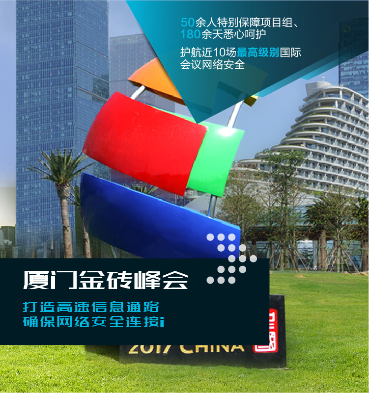 9月3日至5日,厦门金砖峰会暨金砖国家领导人第九次会晤在厦门国际会议中心和会展中心隆重举办。本次峰会意义深远,为保障会议的顺利开展并为与会贵宾带来更好的参会体验,大会主会场、分会场及相关接待酒店的基础设施、安保等级以及大会现场网络通信的畅通性、稳定性与安全性都异常重要。新华三凭借领先的新IT技术、丰富的大会保障经验、高效的执行力以及高度的责任感成为本次大会的网络保障供应商。
