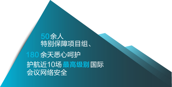 大会期间,无论是各国政府代表团,还是各地新闻媒体记者,亦或是其他参会人员,都会产生大量的瞬时网络接入和访问需求。新华三选择以H3C S12500等交换机服务于整个大会的主会场、新闻中心、工商论坛以及指挥中心,保障会议实时通信以及所有媒体的新闻发布。同时,新华三在主会场与分会场部署近千台高密无线AP WA4330,在所有涉及招待的酒店公共区域部署数千台AP,以保障所有来宾在会议期间的上网和发布需求,全方位确保大会网络的无障碍高速安全连接。作为最高安保级别的国际会议,大会网络安全保障的重要性毋庸置疑。新华三以vBRAS和M9000全线安全产品鼎力支持主会场以及工商论坛的出口认证和安全防护,从而保障所有参会领导的需求及安全。