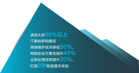 在网络层面,新华三为大桥量身定制的SDN智能网络平台,可按需配置网络资源,支持海量数据传输,实现数据低延时,网络维护成本降低50%、网络安全可靠性提升40%,而高性能AP设备则为通关设备高效运转与无线移动高效查验提供了信息通道保障,能够让旅客以最快8秒的速度高效通关;在底层IT基础设施层面,新华三为大桥各业务系统提供世界一流的服务器、存储及备份解决方案,实现业务处理效率提升30%;在安全层面,为关键业务构建符合国家安全等保三级的安全防护体系,进行全方位保障;在运维层面,新华三的智能运维解决方案有效地简化大桥网络运维复杂度,并大幅降低投资与运维成本。
