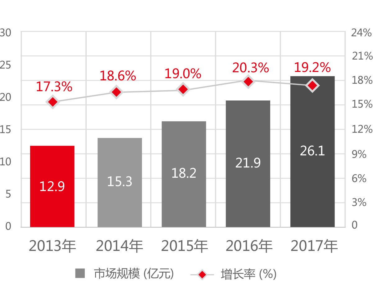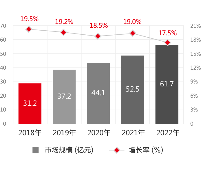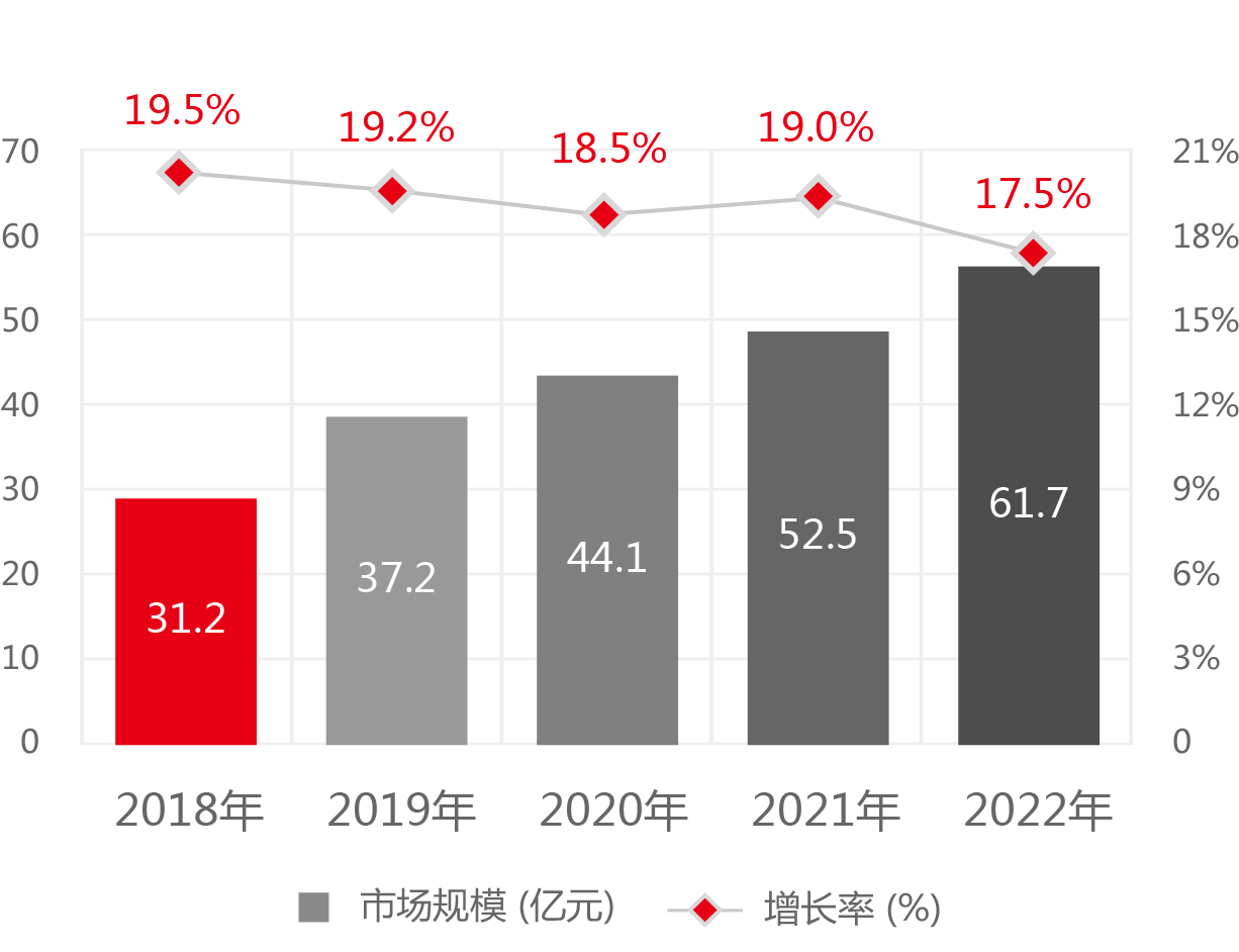 到2022年,市场规模将达到61.7亿元,年均复合增长率18.6%