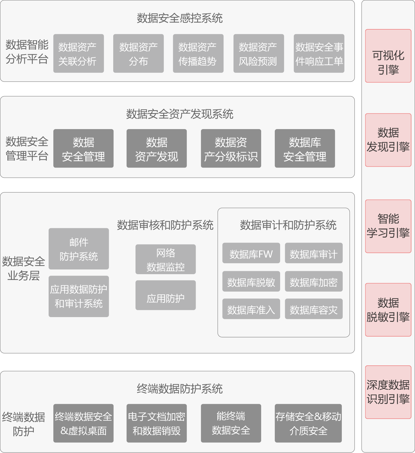 新华三数据安全系统包含深度数据识别引擎、智能学习引擎、可视化引擎、数据发现引擎、数据脱敏引擎五大引擎,以及基于五大引擎构建的数据安全感控系统、网络数据审计和防护系统、应用数据审计和防护系统、邮件防护系统、终端数据防护系统、数据资产发现系统、数据库审计和防护系统七个子系统。
