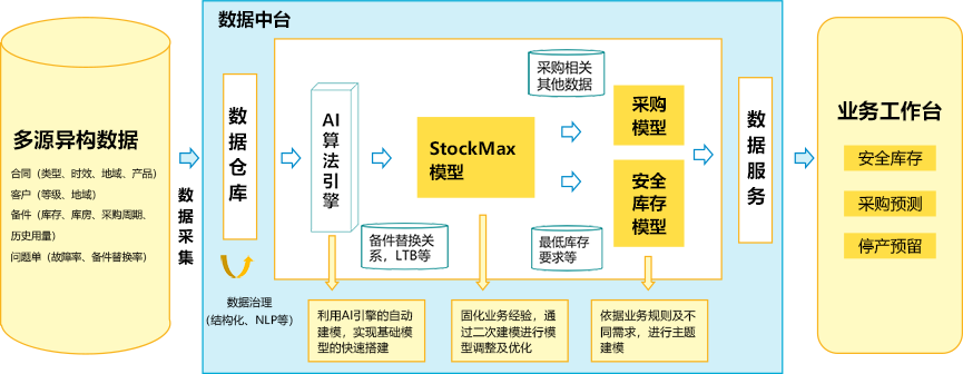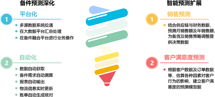 通过专门的数据仓库结合人工智能中台提供的专门算法,有效预测不同备件在不同时期的需求数量,降低库存压力及管理成本,并提升备件交付的可靠性。
