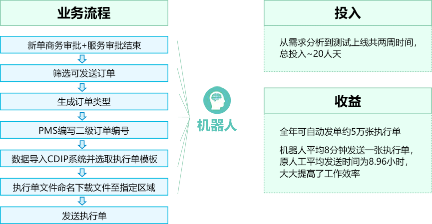 - 订单审批机器人可取代80%的人力工作量,7*24全年无休,可在10分钟内完成订单审批,审批效率是人工的3-10倍,而成本仅为原来的1/9;