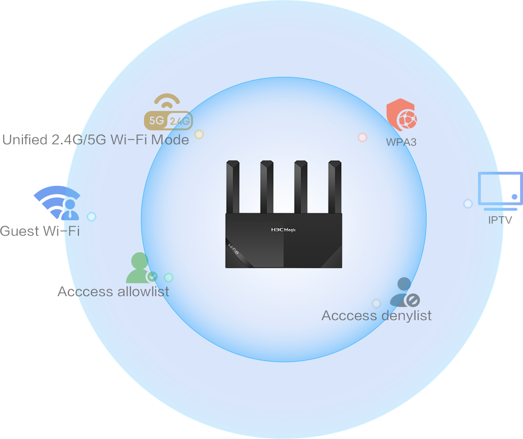 - Guest Wi-Fi, access allowlist and denylist, parental control at multiple time ranges, IP-based traffic control, scheduled Wi-Fi on/off